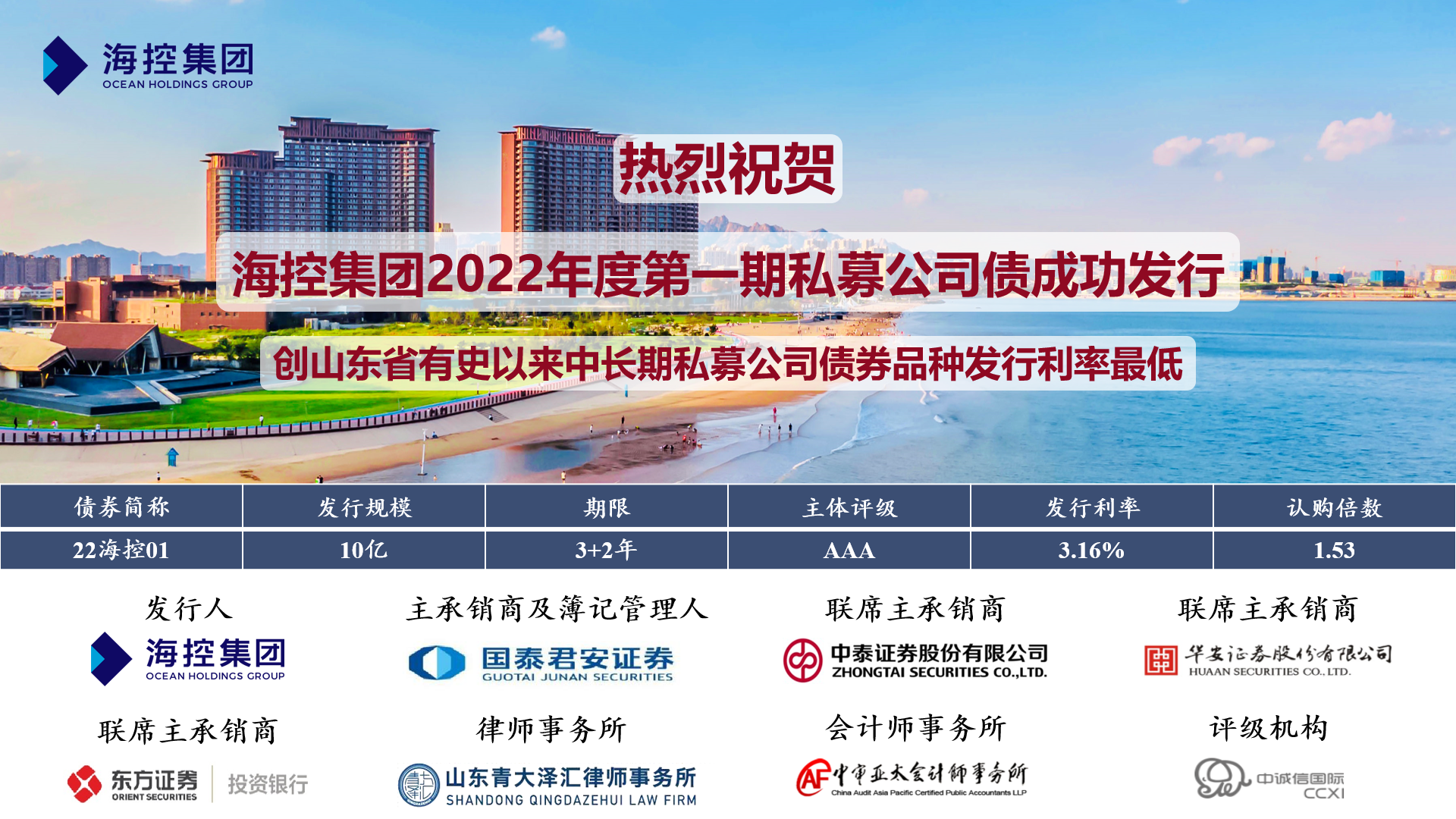 近日,海控集團“2022年非公開發(fā)行公司債券(第一期)”成功發(fā)行,期限3+2年,發(fā)行金額10億元,認購倍數(shù)1.53,發(fā)行票面年化利率3.16%,創(chuàng)有史以來山東地區(qū)國企中長期私募債券品種最低票面利率。