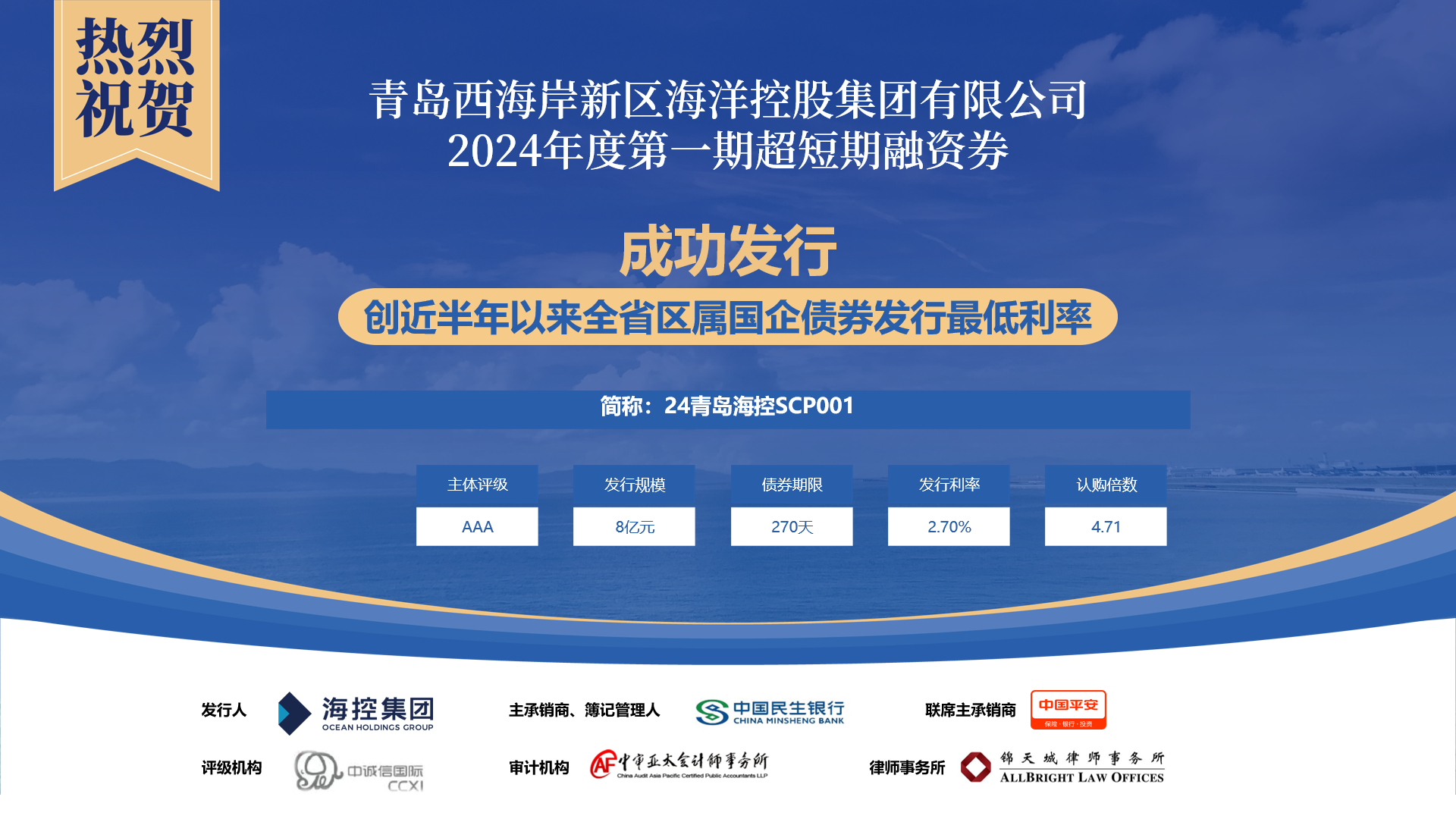 集團2024年債券發行“開門紅”體現了資本市場對??丶瘓F的高度認可。??丶瘓F將繼續深化產業化轉型成果,拓展多元融資渠道,為西海岸新區高質量發展做出更大貢獻。